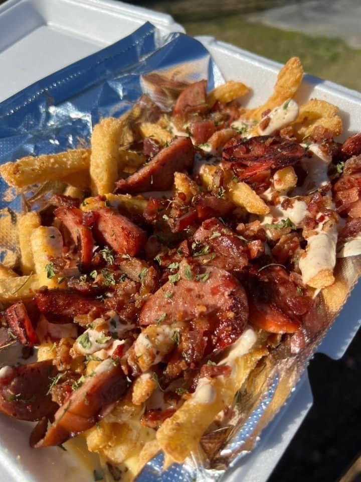 Try our Bubba Fries 3.0 for a crispy delight of fries, topped with cheese sauce, Cajun ranch, bacon pieces, and Polish sausage.