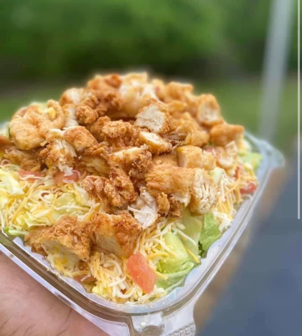 Our salad base features eggs, tomatoes, cheese, bacon, and onions, topped with fried chicken pieces. Choose your dressing from our homemade ranch or blue cheese. You can also opt for grilled chicken instead of fried.