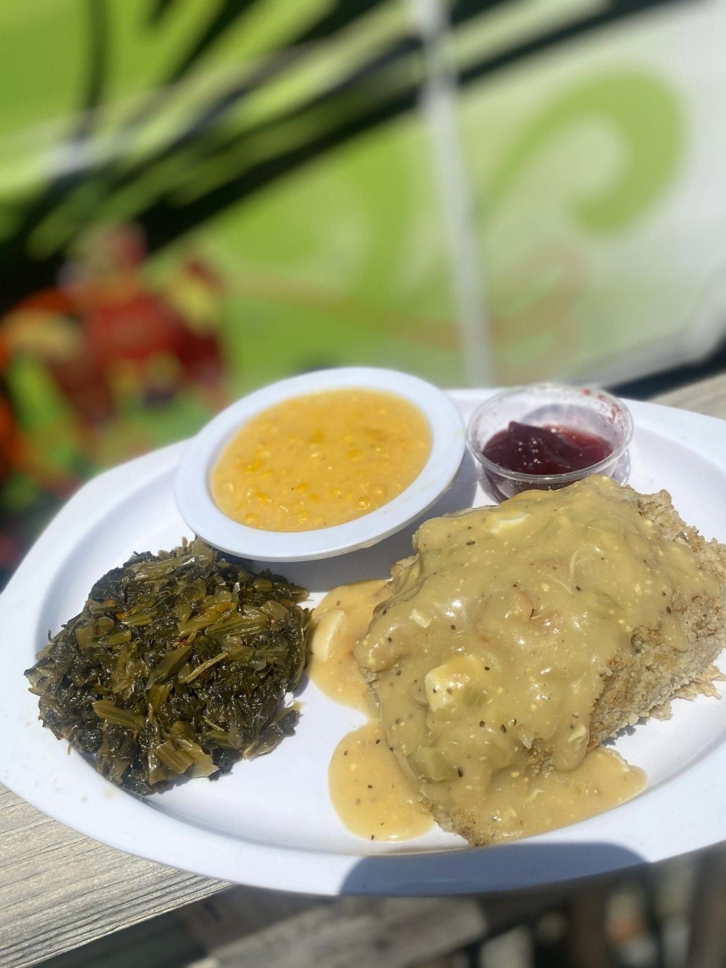 Indulge in our mouth-watering chicken and dressing, reminiscent of Thanksgiving, served with your choice of two sides. Pictured are corn and turnip greens.